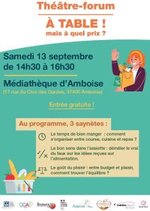 Samedi 13 septembre, la médiathèque d’Amboise a accueilli le théâtre forum « À table ! mais à quel prix ? », une animation originale et participative sur le thème de l’alimentation, mise en place en partenariat avec la MSA Berry-Touraine et le CCAS d’Amboise. 17 personnes ont répondu présent à ce rendez-vous convivial.