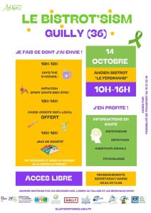 Plus de 70 personnes ont participé, mardi 7 octobre à Giroux et mardi 14 octobre à Guilly à la journée Bistrot’SIMS, dans le cadre des semaines d’information sur la Santé Mentale (SISM) . L’objectif poursuivi avec les acteurs de santé était de permettre aux habitants de se retrouver ou de se rencontrer, d’échanger ensemble, et profiter d’un moment convivial autour d’un café ou d’un thé, dans une ambiance bistrot.